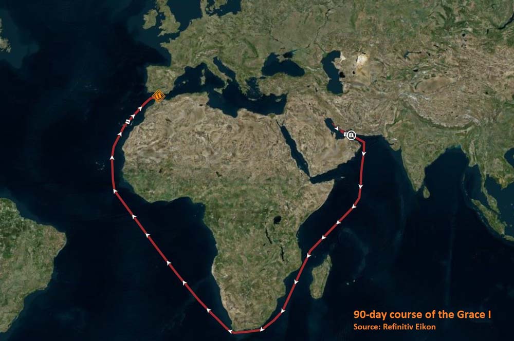 Ship mapping records from data firm Refinitiv show that in the latest case the Grace 1 sailed to the Mediterranean around the southern tip of Africa, instead of via Egypt’s Suez Canal.