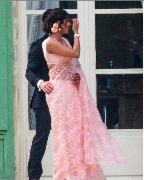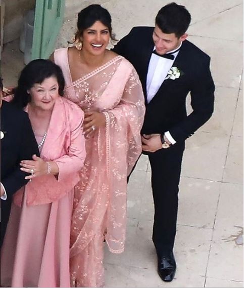 At the ceremony, the dusky beauty was clad in a pink Sabyasachi sari and a sleeveless blouse, with her hair tied in a bun, accessorised nothing but a rose while Nick looked dapper in a tuxedo.